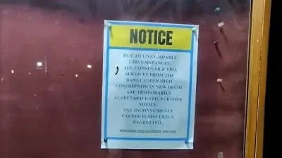 बांग्लादेश में बढ़ती अशांति के बीच दिल्ली से एक बड़ी खबर सामने आई है। दिल्ली में बांग्लादेश हाई कमीशन के बाहर एक नोटिस लगाया गया है। नोटिस में लिखा है, “कुछ ज़रूरी कारणों से, नई दिल्ली में बांग्लादेश हाई कमीशन से सभी कांसुलर और वीजा सेवाएं अगले आदेश तक अस्थायी रूप से बंद कर दी गई हैं।”