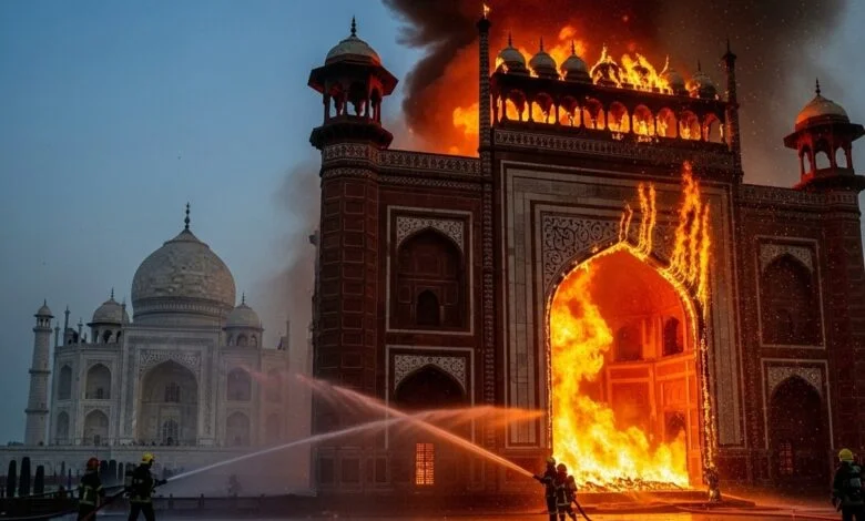 यूपी के आगरा से बड़ी खबर सामने आई है। यहां रविवार को ताजमहल परिसर में आग लग गई। ये आग मुख्य गुंबद से 300 मीटर दूर दक्षिणी गेट के पास लगी है। अचानक उठी चिंगारी देख लोग दहशत में आ गए हैं। मौके पर आग की लपटों के साथ घना काला धुआं भी देखा गया है।